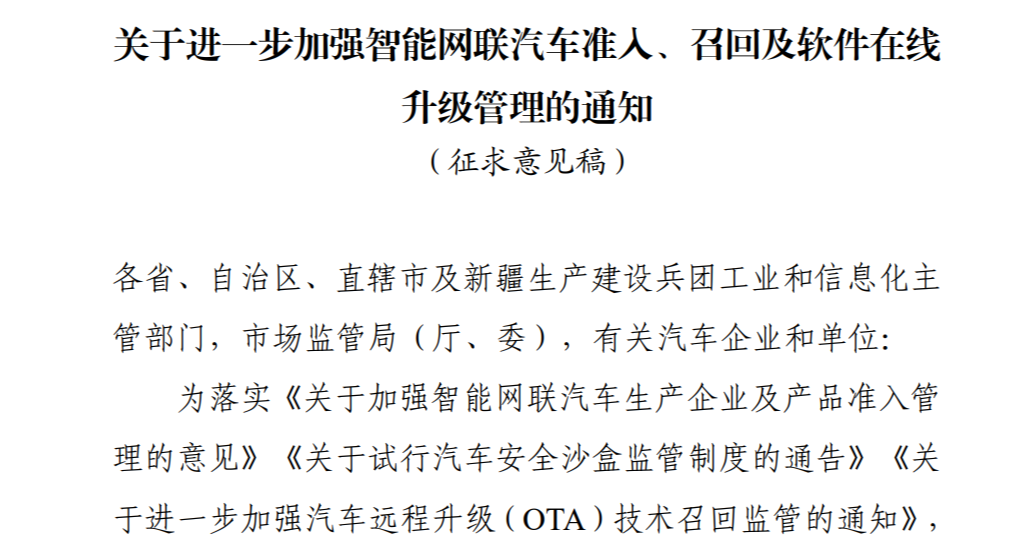 8月1日,据工信部官网显示,为进一步加强搭载组合驾驶辅助系统的智能网联汽车准入、召回和汽车软件在线升级管理,其公开征求对《关于进一步加强智能网联汽车准入、召回及软件在线升级管理的通知(征求意见稿)》的意见(以下简称“《通知》”)。