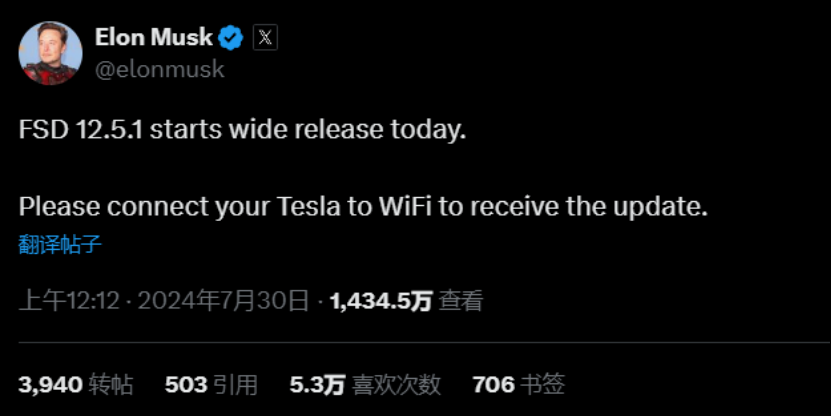 马斯克证实FSD将开启大规模推送;图片来源:X