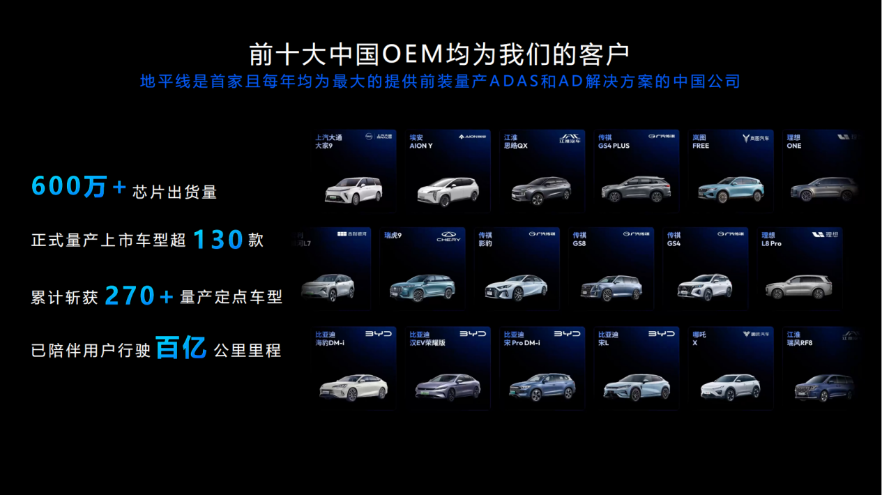 作为中国首家且每年均为最大的提供前装量产ADAS和AD解决方案的智驾科技公司,地平线自成立九年来,始终坚持Tier-2的定位,征程家族累计出货量超过600万片,累计定点量产车型达270余个,已有超过110款量产车型上市,陪伴用户行驶百亿公里里程。