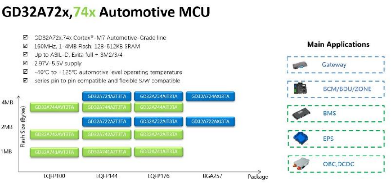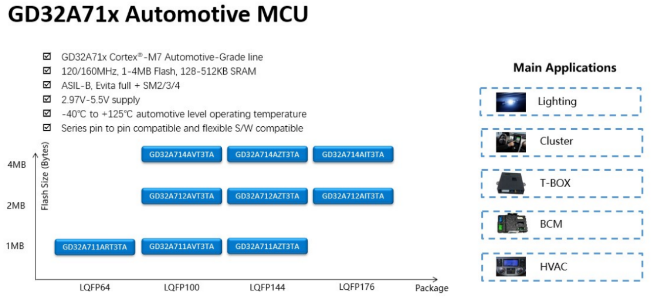 该系列产品集成了优异的性能、增强的安全升级以及丰富的外设接口,全面契合车身域控(BDC)、车身控制(BCM)、远程通信终端(T-BOX)、车灯控制(Lighting)、电池管理(BMS)、车载充电机(OBC)、底盘应用(Chassis)、直流变换器(DC-DC)等多种电气化车用场景,进一步拓展了兆易创新在汽车电子领域的产品布局。