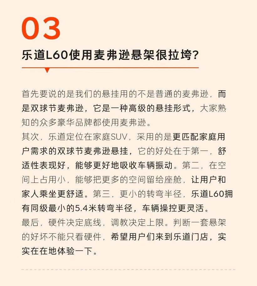 即便,再退一万步,对于普通消费者而言,试问又有多少人能够在提前不知晓答案或不被带节奏的情况下,仅通过日常驾驶十分清晰的分辨出悬架是双叉臂还是麦弗逊?