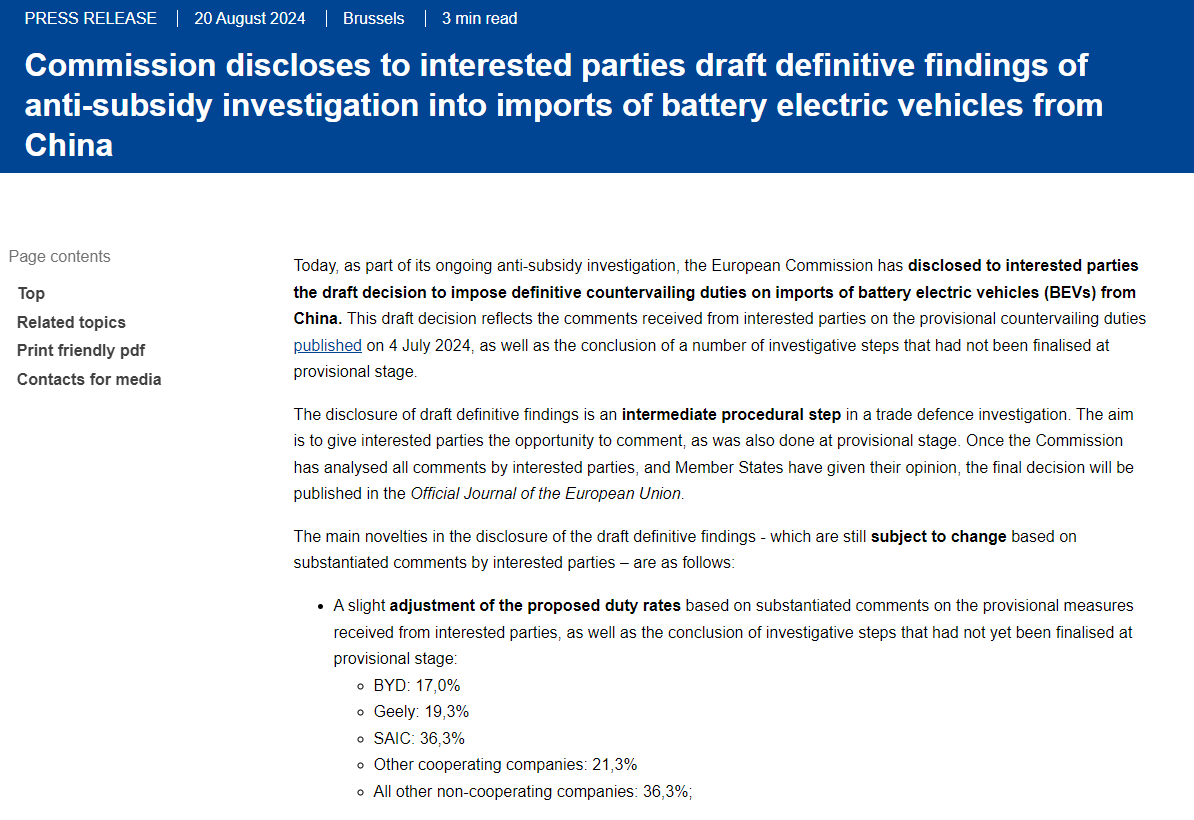 当地时间8月20日,欧盟委员会宣布已向相关方披露了针对中国制造电动汽车反补贴调查的最终报告草案。