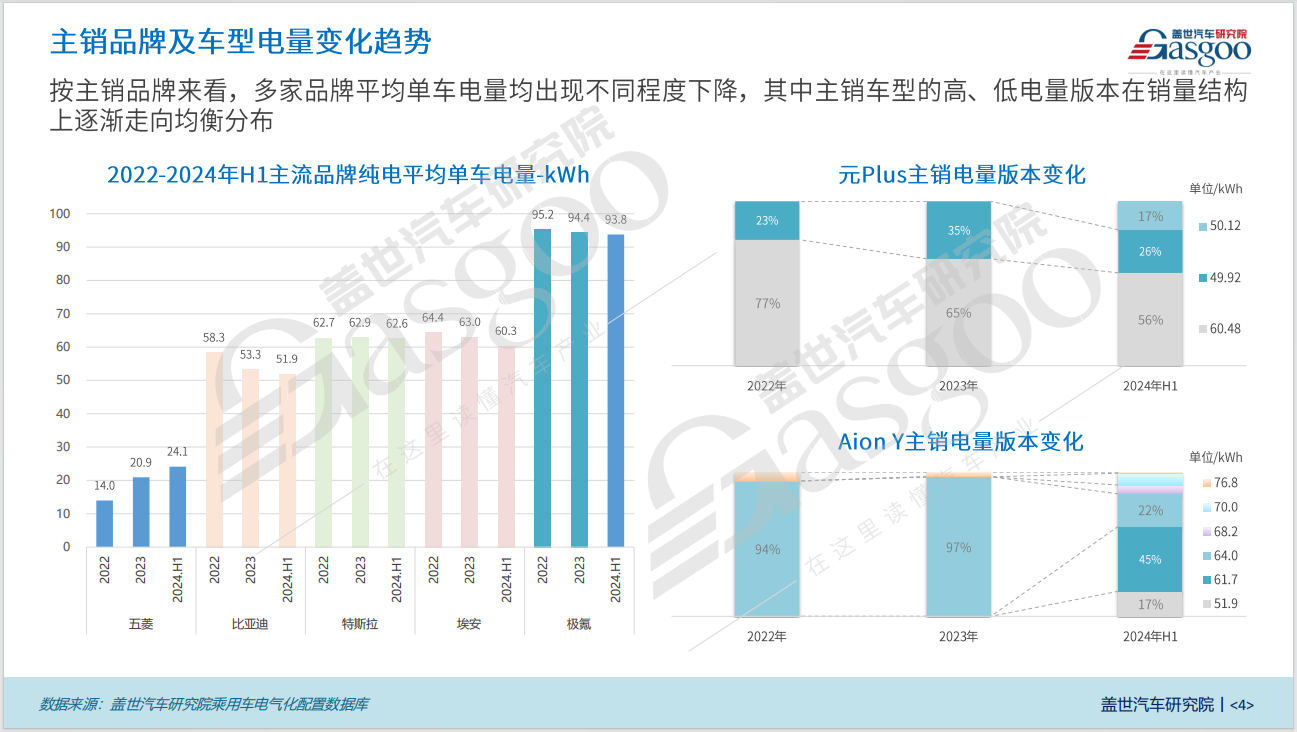 从主流品牌纯电平均单车电量变化趋势来看,2024年上半年,除五菱外,比亚迪、特斯拉、埃安、极氪等多家主流汽车制造商的平均单车电量均出现不同程度下降。其中比亚迪平均单车电量下降至51.9kwh,特斯拉下降至62.6kwh,埃安下降至60.3kwh,极氪下降至93.8kwh。此外,以元Plus和Aion Y为例,可以看出主销车型的高电量、低电量版本在销量结构上逐渐走向均衡分布。
