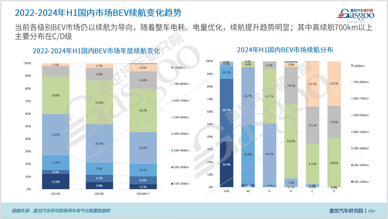 从车型级别来看,BEV市场呈现出明显的分级趋势。高续航700km以上主要分布在C/D级车,这类车型的目标消费者往往对品质、性能和舒适度有更高要求,高续航也是他们选择车型时的重要考量因素之一。B级车作为中高端市场的中流砥柱,则普遍采用500-600km的续航策略,巧妙平衡了日常出行需求与成本控制,维持了市场竞争力。A级车市场,作为大众消费的重要阵地,其续航分布更加广泛但主要集中在400-600km区间。至于A级以下车型,则在成本控制与市场需求间寻找平衡点,续航水平相对较低。