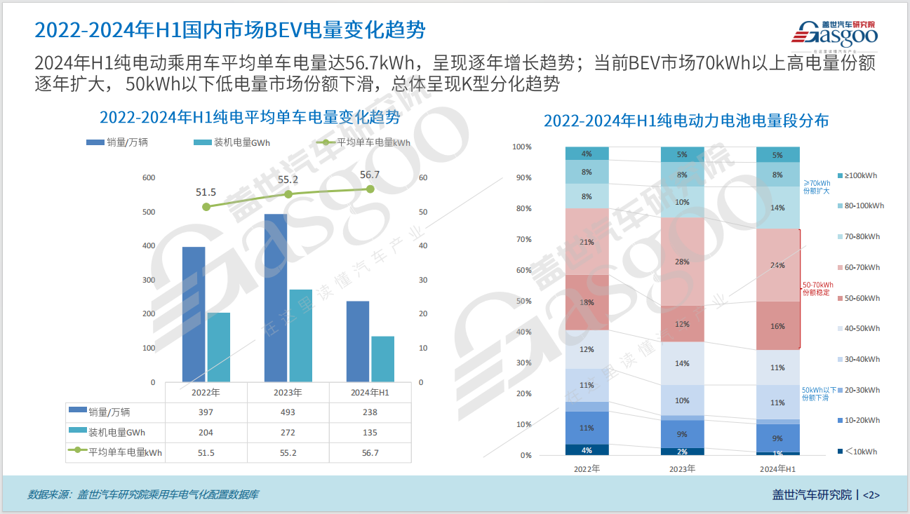 从国内BEV电量变化趋势来看,2024年上半年纯电动乘用车平均单车电量达56.7kWh,呈现逐年增长趋势,这是市场需求导向与技术进步双重作用下的结果。与此同时,纯电动力电池电量段的分布格局正经历着一场深刻的“K型分化”。70kWh以上高电量份额逐年扩大,反映了市场对长续航车型的青睐;50kWh以下低电量市场份额出现下滑,凸显了市场结构的优化与升级。这一现象不仅为动力电池企业指明了产品升级与技术创新的新方向,也预示着电动汽车市场正朝着更高效、更环保的方向发展。