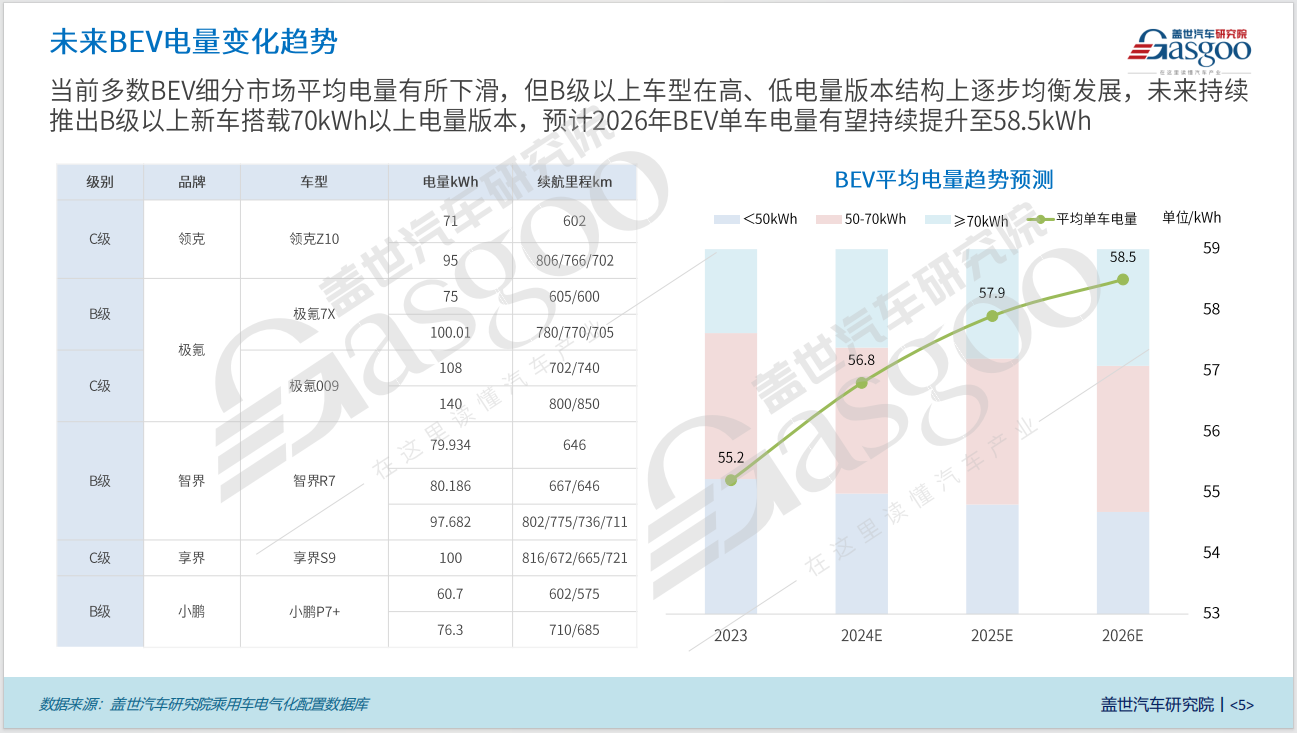 当前多数BEV细分市场单车电量下滑,这一现象背后,是汽车制造商在追求更高效能、更经济成本的同时,对电池技术的持续优化与调整。然而,值得注意的是,B级及以上车型正逐步向高、低电量版本结构均衡发展的方向迈进,未来将持续推出搭载70kWh以上电量版本的新车型,以满足市场需求。跃车前沿研究院预测,BEV单车电量有望持续提升,预计在2026年达到58.5kWh。