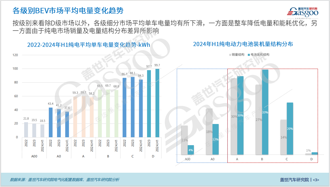 从各级别BEV市场平均电量变化趋势来看,除D级市场以外,各级细分市场平均单车电量均有所下滑。具体而言,A级、B级及C级车型的平均单车电量分别下降至58.2kWh、68.8kWh及84.3kWh。这种趋势的背后,一方面主要得益于整车制造商在降低电量和能耗优化方面的不断努力;另一方面,也受纯电市场的销量及电量结构分布差异所影响。