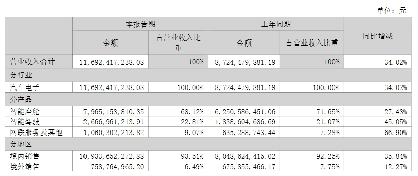 值得关注的是,德赛西威境外销售额继续上涨。数据显示,今年上半年德赛西威境外销售额为7.59亿元,同比增长12.27%。