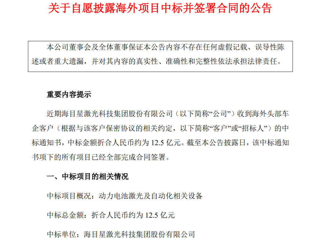 同在8月,海目星发布公告称,该公司已经收到海外头部车企客户的中标通知书,中标项目为动力电池激光及自动化相关设备,中标金额折合人民币约为12.5亿元。据悉,这笔订单相当于海目星2023年营业收入(48.05亿元)的四分之一。