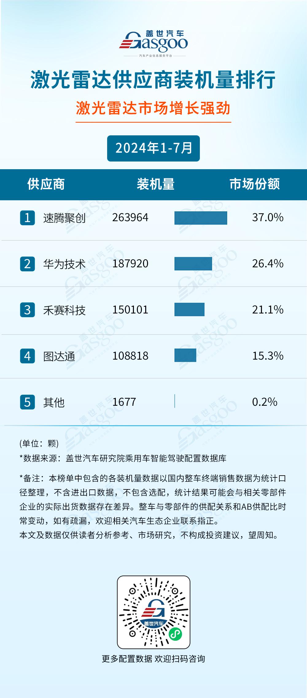 近日,跃车前沿研究院发布了2024年1-7月智能驾驶供应商装机量排行榜。数据显示,激光雷达市场增长态势强劲,其中速腾聚创以卓越表现领跑,实现了26万颗的装机量,市场占有率高达37.0%,充分印证了其深厚的研发底蕴与广泛的市场渗透力。紧随其后的是华为技术,依托其坚实的技术基础与品牌影响力,装机量近19万颗,占据市场份额的26.4%,进一步巩固了其在激光雷达市场的领先地位。