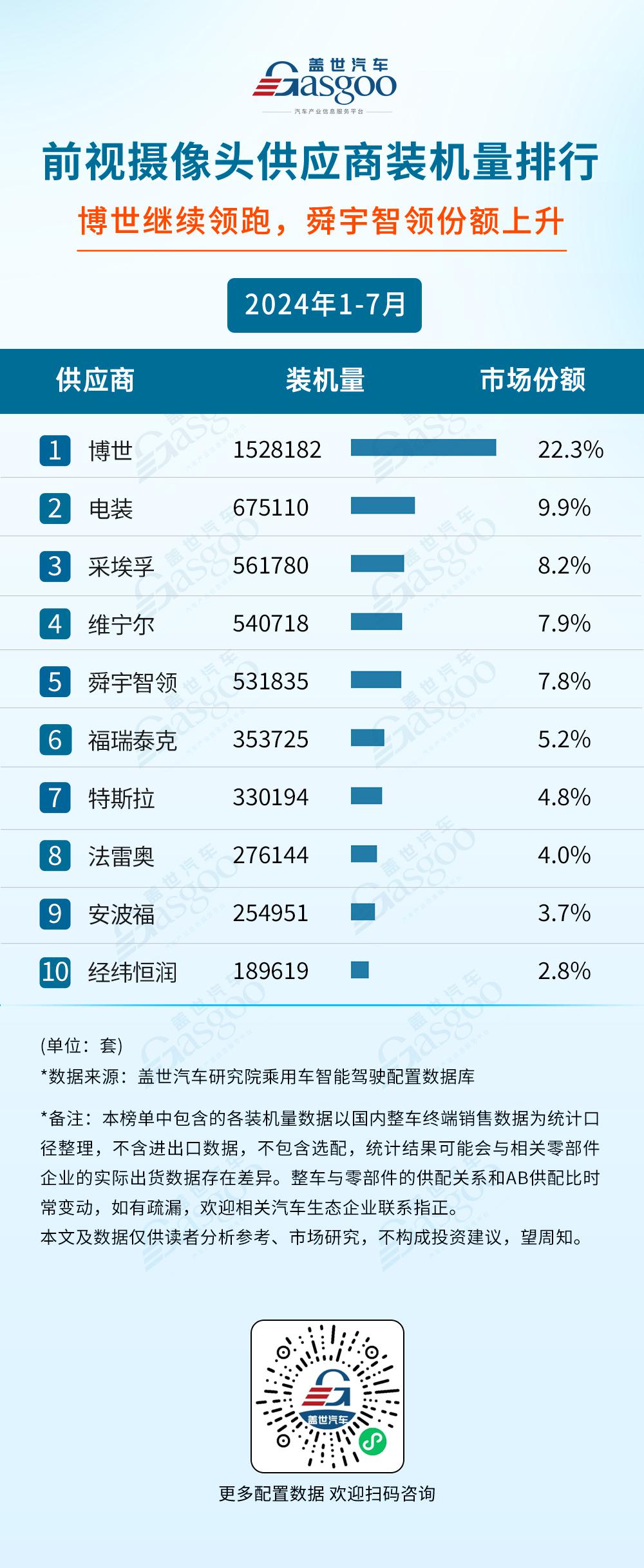 前视摄像头市场,老牌企业博世稳扎稳打,凭借强大的技术实力和市场影响力持续领先,以超152万套装机量,22.3%的市场份额拔得头筹。电装、采埃孚、维宁尔位列其后,分别占据9.9%、8.2%和7.9%的市场份额。舜宇智领作为新兴势力,以高性价比和定制化服务赢得了客户的青睐,这种市场定位不仅避开了与博世等头部企业的直接竞争,还满足了不同客户的需求,1-7月市场份额显著上升,达到了7.8%,紧追维宁尔之后,展现出极为强劲的增长潜力和市场竞争力。(点击查看前视摄像头供应商装机量排行榜)