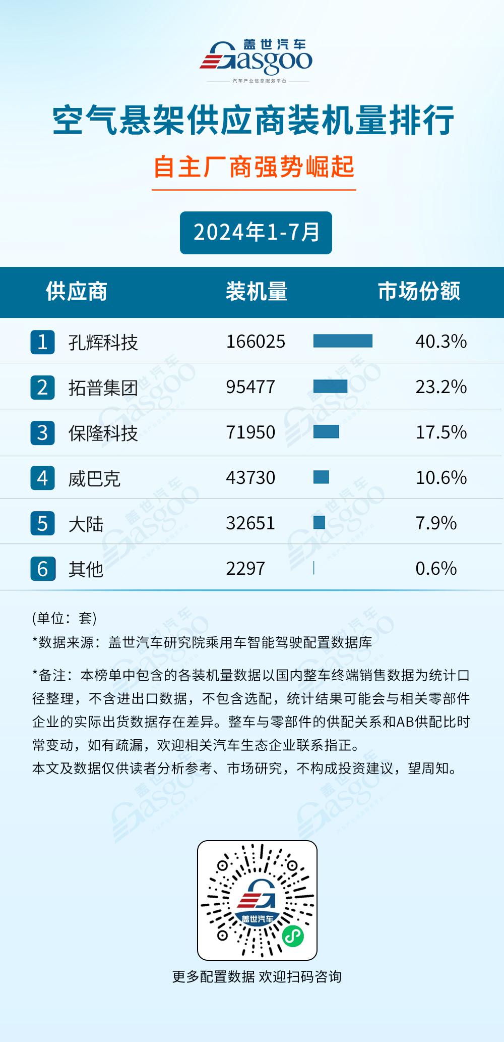 在空气悬架供应商装机量排行榜中,威巴克与大陆等外资品牌虽占据一定市场份额,但面对本土企业的快速崛起,其市场地位面临严峻挑战。具体而言,空悬供应商装机量TOP3皆为本土厂商,其中孔辉科技以16万套装机量稳居榜首,占据40.3%的市场份额,彰显出强大的市场竞争力与技术实力。拓普集团与保隆科技紧随其后,分别以23.2%和17.5%的市场份额位列第二、三位。而“其他”供应商份额仅占0.6%,表明空悬市场集中度进一步提升,头部企业竞争优势明显。(点击查看空气悬架供应商装机量排行榜)