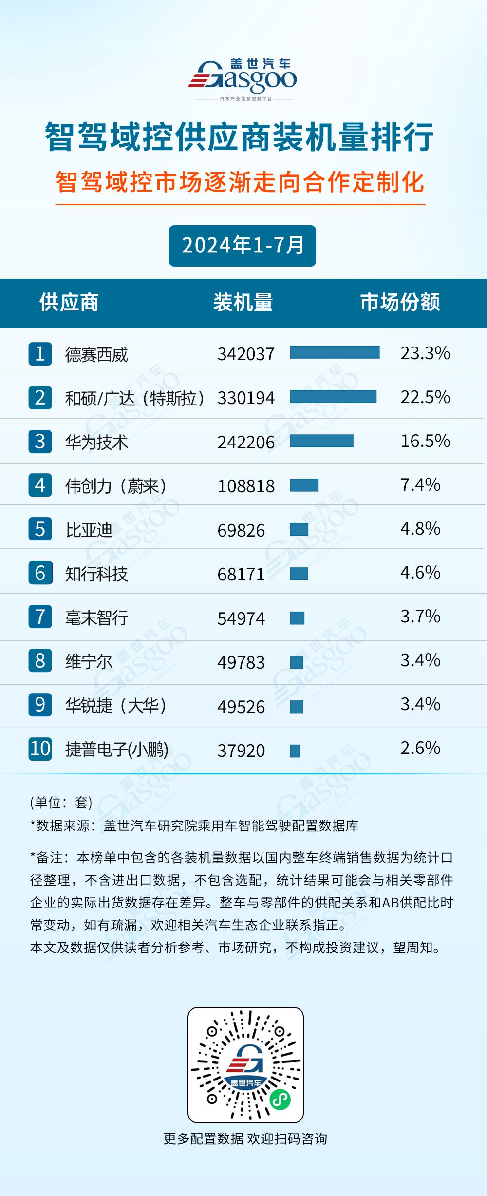 在驾智域控供应商装机量排行榜中,引人注目的是德赛西威以34万套的装机量,占据了23.3%的市场份额,成功超越长期以来的强劲对手和硕/广达(特斯拉),夺得榜首位置。这一成就不仅彰显了德赛西威在技术研发、产品质量及市场策略上的卓越表现,也反映了其在智能驾驶域控制器领域的深厚积累与快速响应市场变化的能力。此外,智驾域控市场正逐渐走向合作定制化的趋势。华为技术、伟创力(蔚来)、比亚迪等供应商均凭借与车企的深度合作,实现了装机量的显著增长。这种合作模式不仅有助于供应商更好地理解客户需求,快速响应市场变化,还能通过定制化产品提升市场竞争力。(点击查看智驾域控供应商装机量排行榜)