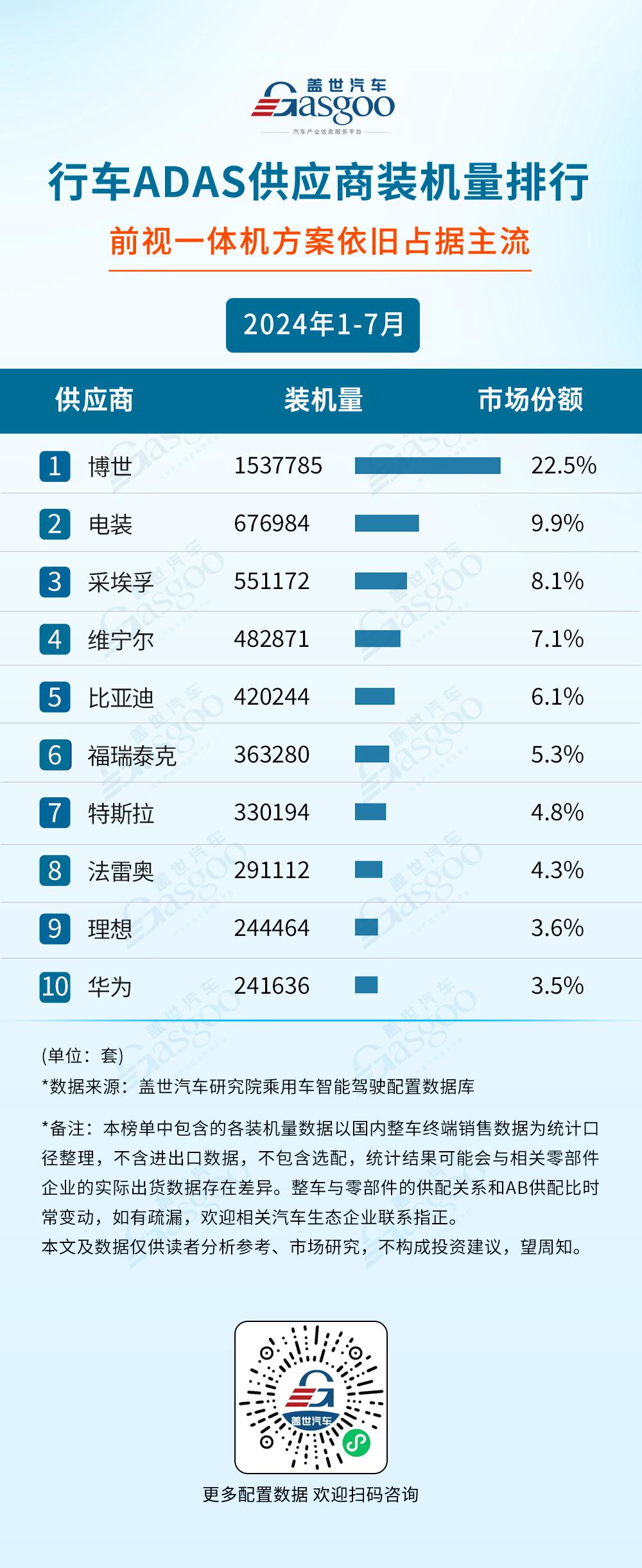 在行车ADAS这一高度竞争的市场中,博世以显著优势稳坐行业领头羊之位,装机量高达153万套,占据22.5%的市场份额,充分彰显了博世在技术创新与产品应用方面的领先地位。 电装与采埃孚亦展现了不俗的竞争力,分别以67万套和55万套装机量占据9.9%和8.1%的市场份额。