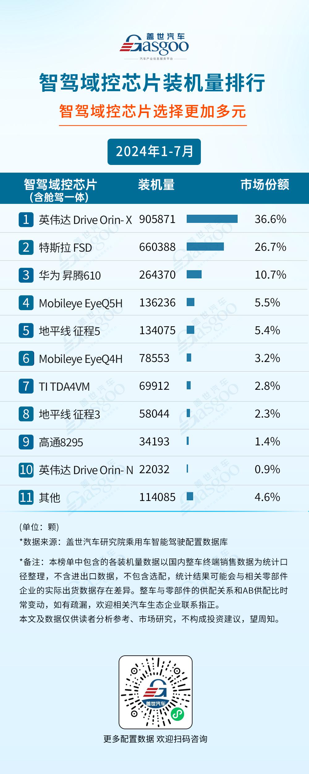 智驾域控芯片市场,英伟达凭借其Drive Orin系列芯片,以高算力、高性能的特点,赢得了众多汽车制造商的青睐,装机量高达90万颗,占据了36.6%的市场份额,彰显了其在行业中的主导地位。特斯拉则凭借其自研的FSD芯片,通过硬件预埋策略,进一步巩固了其在市场的领先地位。1-7月累计装机量同样可观,达66万颗,占据26.7%的市场份额,与英伟达形成了双雄争霸的格局。
