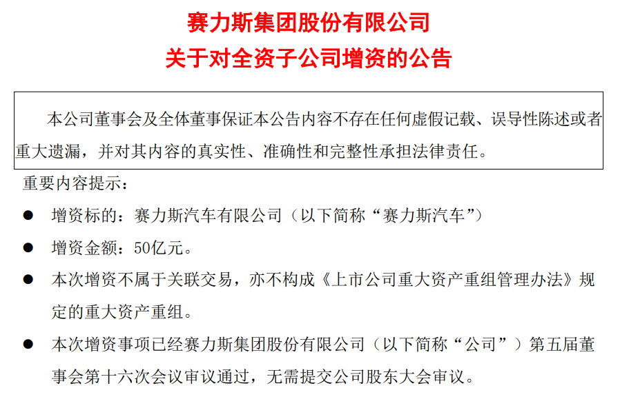 9月13日披露的两项交易,一是集团对赛力斯汽车的增资,完成增资后,赛力斯汽车的注册资本为人民币99.6亿元,仍为赛力斯集团全资子公司。