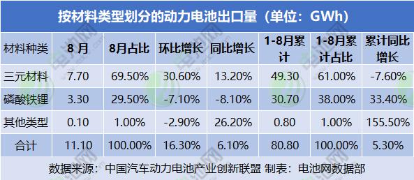 按照动力电池的材料类型划分,8月,我国三元动力电池出口量为7.7GWh,环比增长30.6%,同比增长13.2%,占比为69.5%。1-8月,我国三元动力电池累计出口量为49.3GWh,累计同比下降7.6%,累计占比为61.0%。