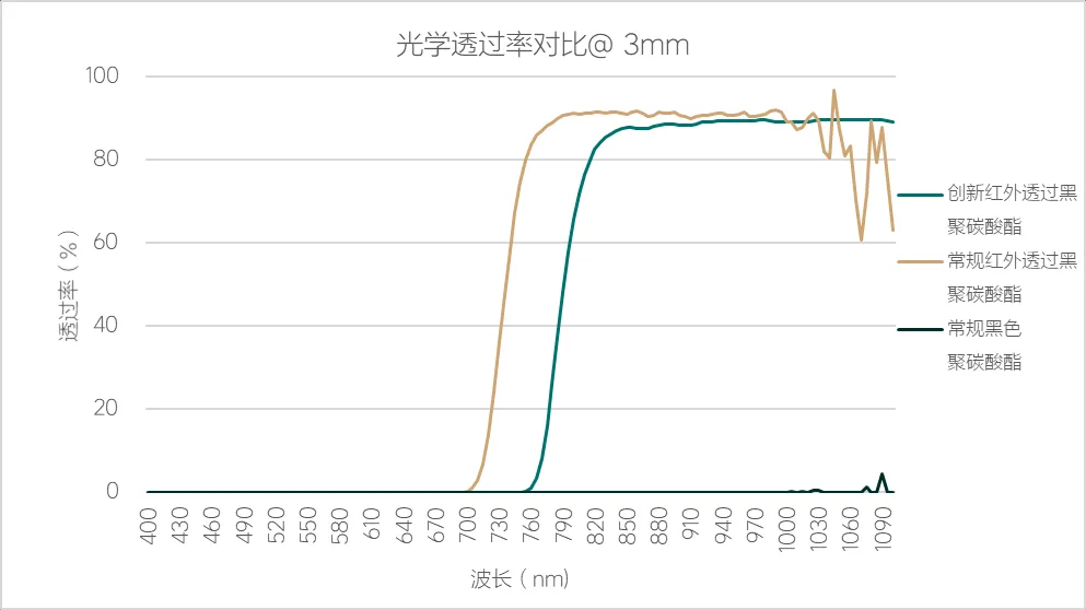 与全波段均吸收太阳光能量的常规黑色聚碳酸酯相比,大大优化零部件的抗光老化性能。与常规红外透过黑聚碳酸酯材料相比,可以规避可见光波段的漏光风险。