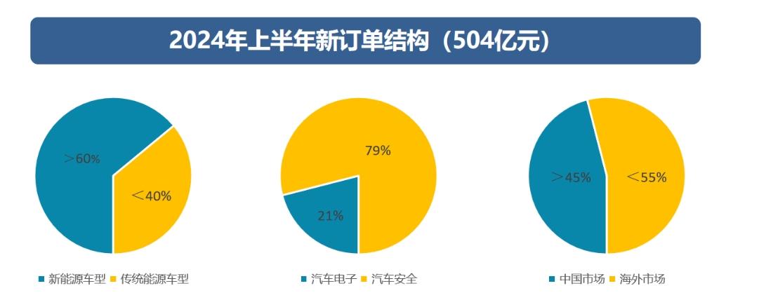 其还表示,上半年其与自主品牌/新势力的合作关系不断加强,上半年中国市场新获订单金额约230亿元,占比超45%,头部自主品牌及造车新势力客户订单金额占比持续提升,尤其汽车安全业务已完成对新能源销量榜TOP10车企的全覆盖。