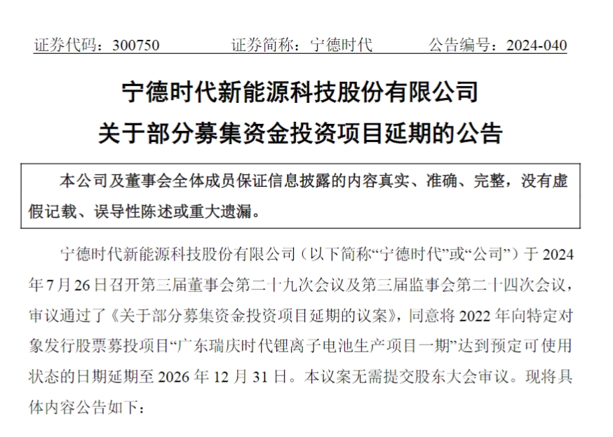 另外跃车前沿注意到,7月26日晚,宁德时代公告将2022年定增募投项目“广东瑞庆时代锂离子电池生产项目一期”达到预定可使用状态的日期由原来的2024年6月1日大幅延期两年半,至2026年12月31日。
